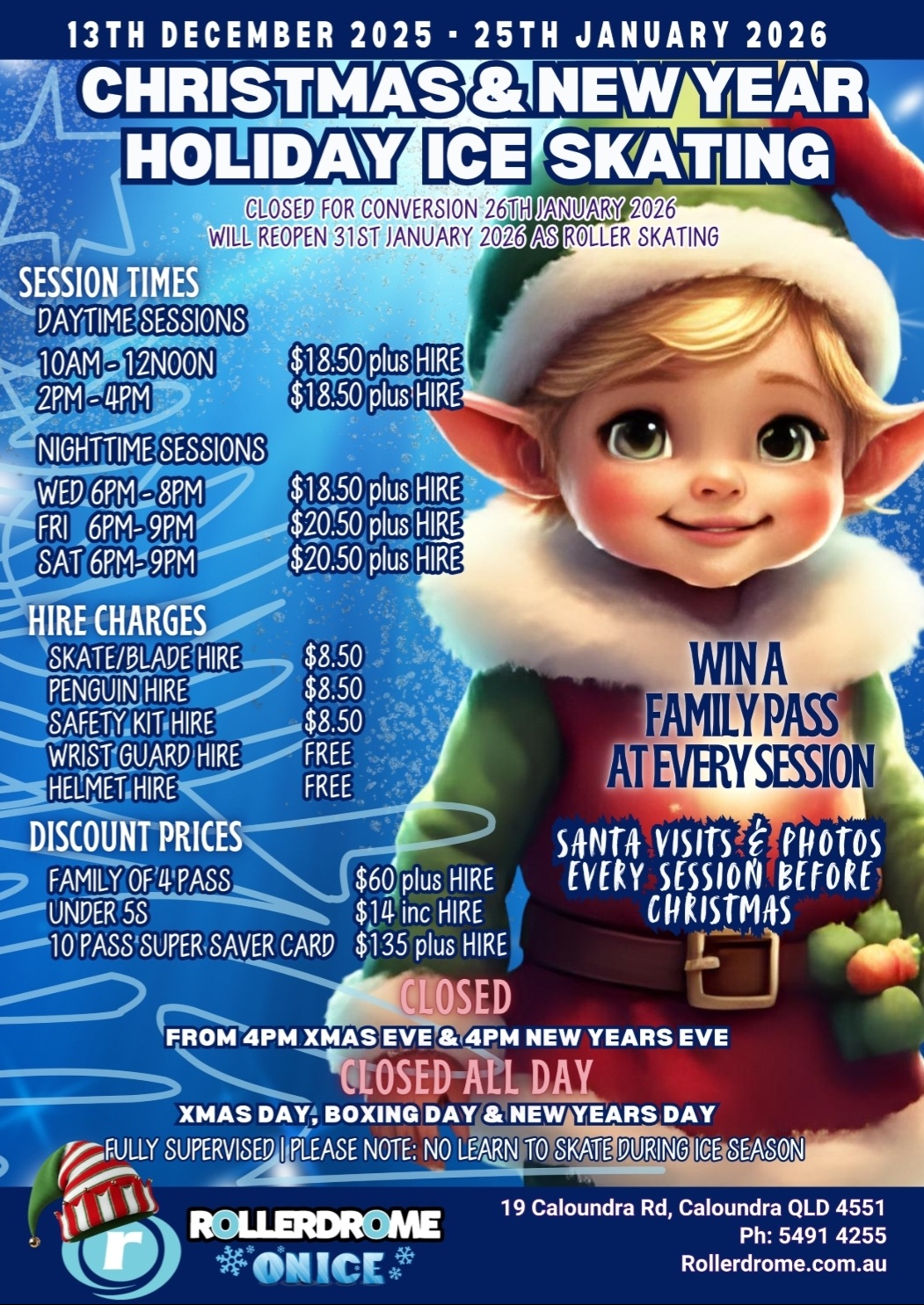 • 10 Pass Super Saver Card – $135.00 plus HIRE – (Save up to $50 with this pre-paid pass. Valid at all general sessions. Not valid for Learn to Skate classes/some special events)