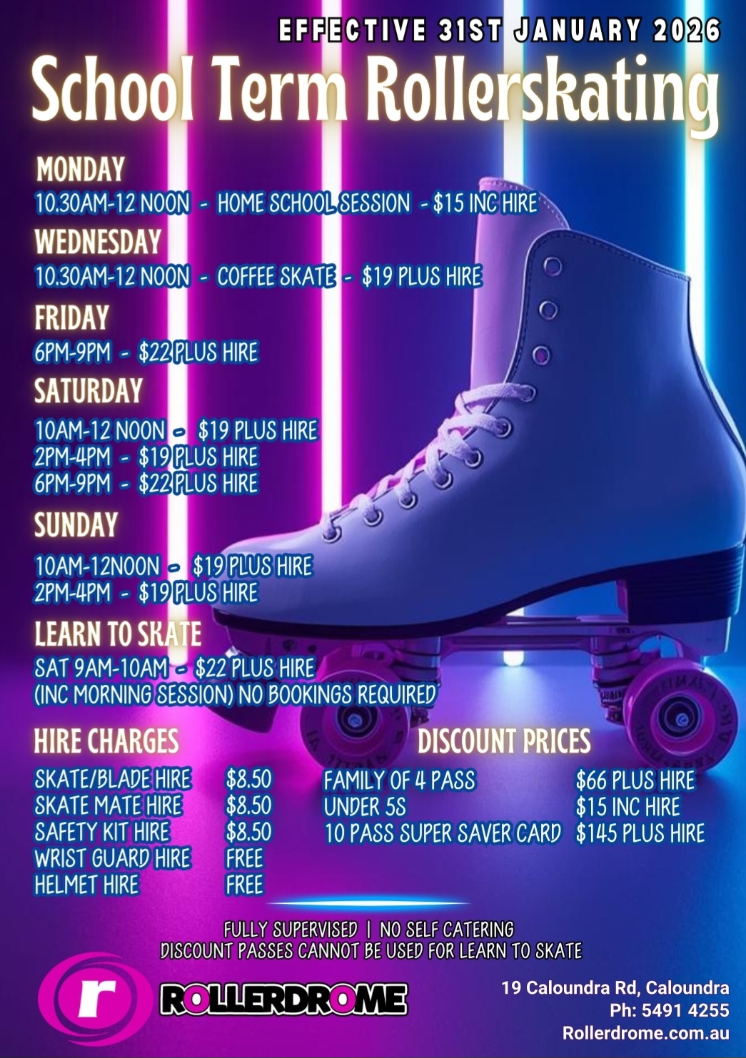- 9.00AM – 10.00AM (Learn to Skate, inc Morning Session) – $22.00 ENTRY plus HIRE